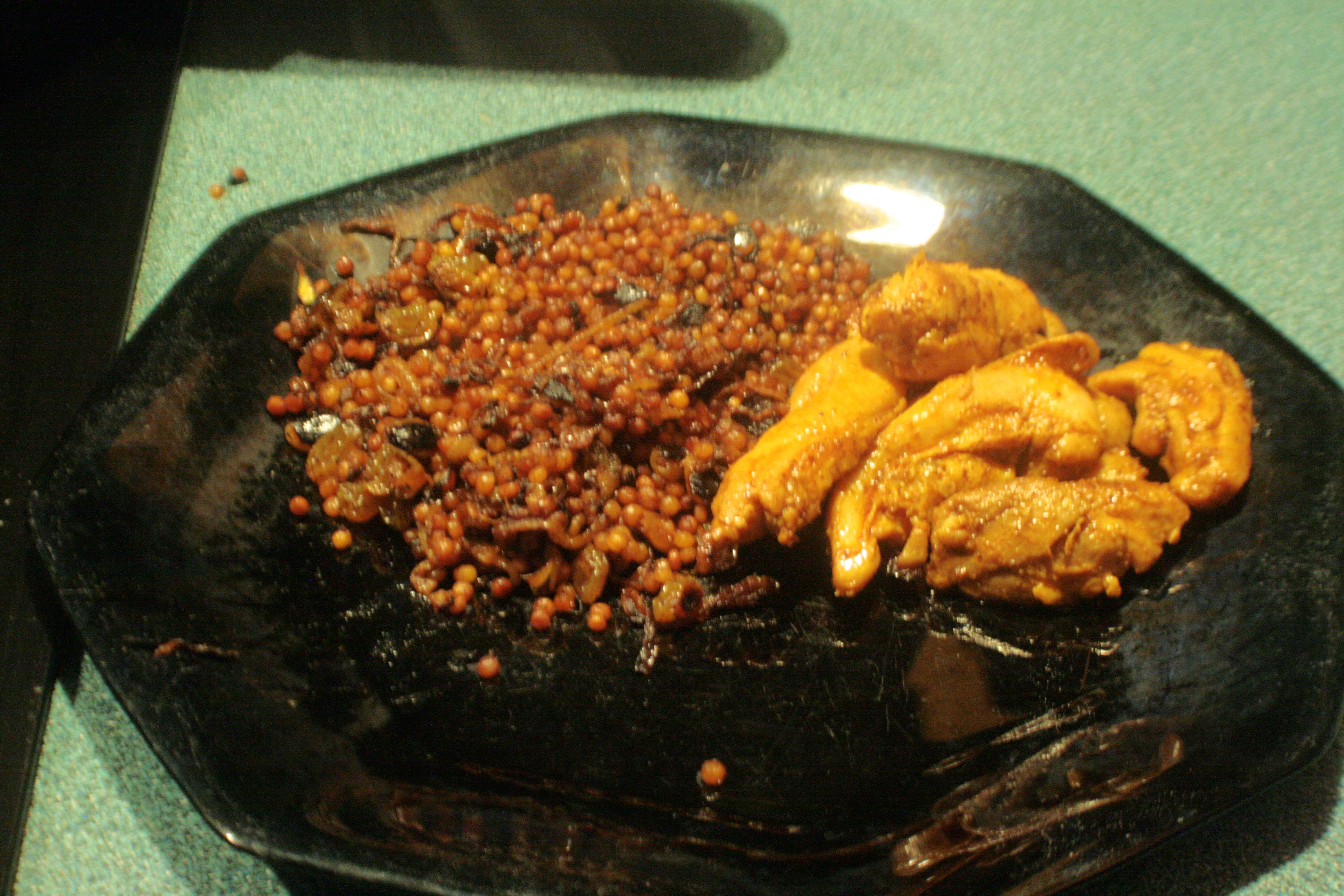 I’ve never quite gotten it right, making it at home. But I was thinking about it the other night when, in the middle of an excruciatingly stressful week, I decided to declare bankruptcy on my to do list and cook dinner. I didn’t have lentils. Or the time to do the pre-cooking rice soaking that I’ve gotten fond of when doing stir fry style dishes. So I decided to fake it with couscous and chicken.