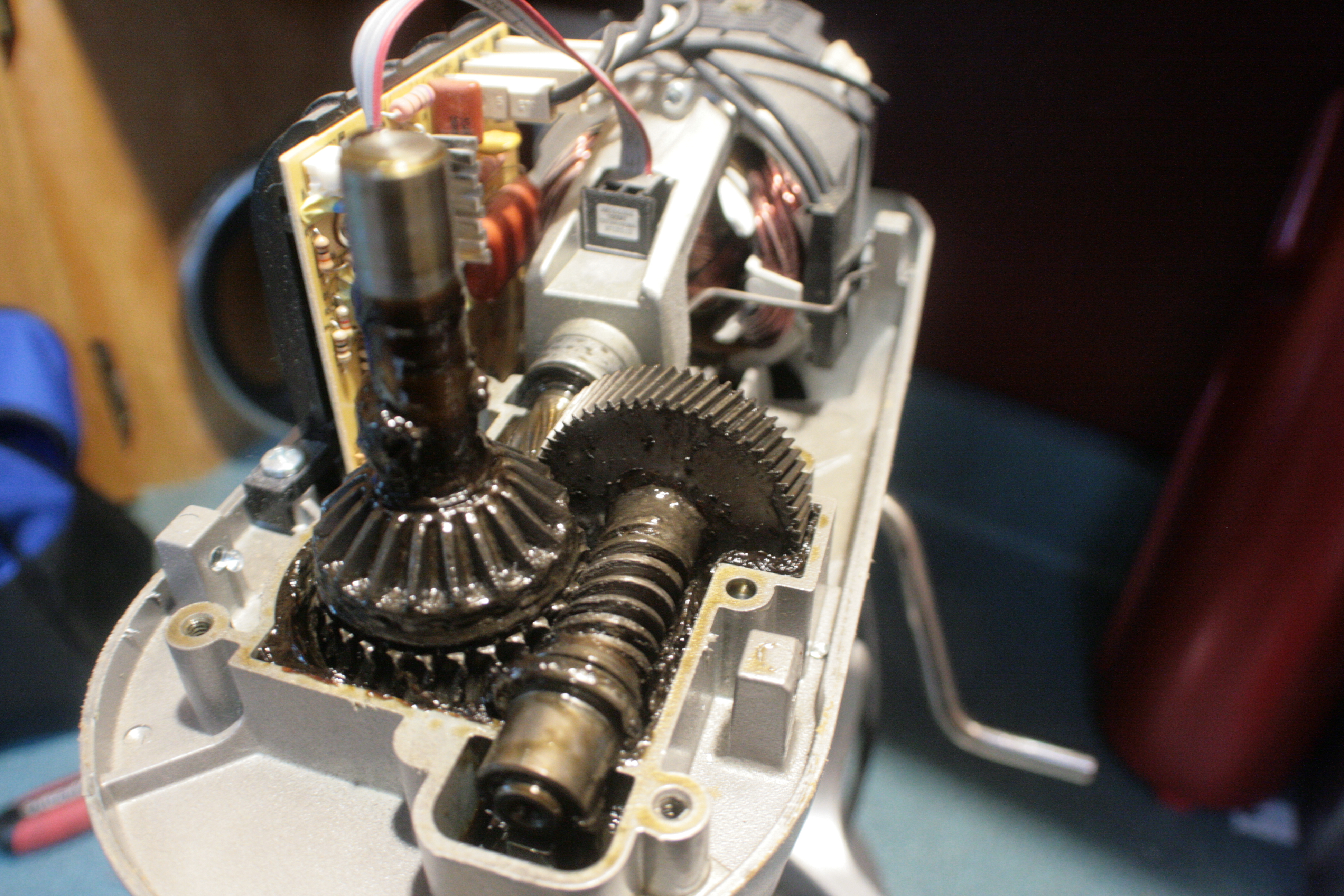 Armed with pliers, I do it. I get the gears off, I put new ones in. I have a whole can of new grease I use to coat everything. I put it all back together and it rotates and is lovely and works. I make brownies. Delicious! I make bread.
